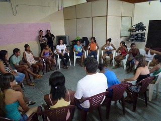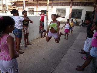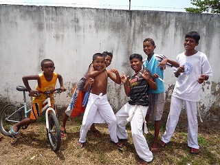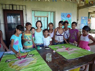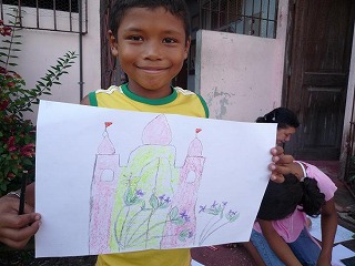 私は、2009/7/27〜9/3まで、日本からの研修生としてエマウスに滞在しました。ベレンに到着したのは7月の休暇が終り、8月の新学期を迎える時期でした。7/27にベングイという地区にある施設で行われたミーティングに参加し、スタッフ達に紹介してもらいました。15人程集まっていて、意外と大きな組織なのだと驚いたことを覚えています。翌日から、色々なスタッフの家に滞在させてもらい、各家を拠点にジュルーナスという地区の施設に毎日通うことになりました。7月最後の週は午前中だけなので、20〜30人くらいの子どもたちが来て、絵を描いたり遊んだりしていました。毎日少しずつ増える子どもたちは「日本語でしゃべって!」「名前を書いて!」と、どんどん話しかけてくれたので、少し緊張していた私も、すぐジュルーナスの生活になじむことができました。